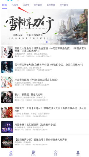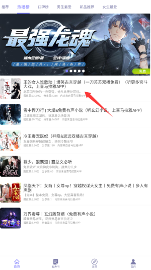 1、启动听书精灵APP后,在首页导航栏选择"热播榜单"栏目,这里展示最受欢迎的听书作品。