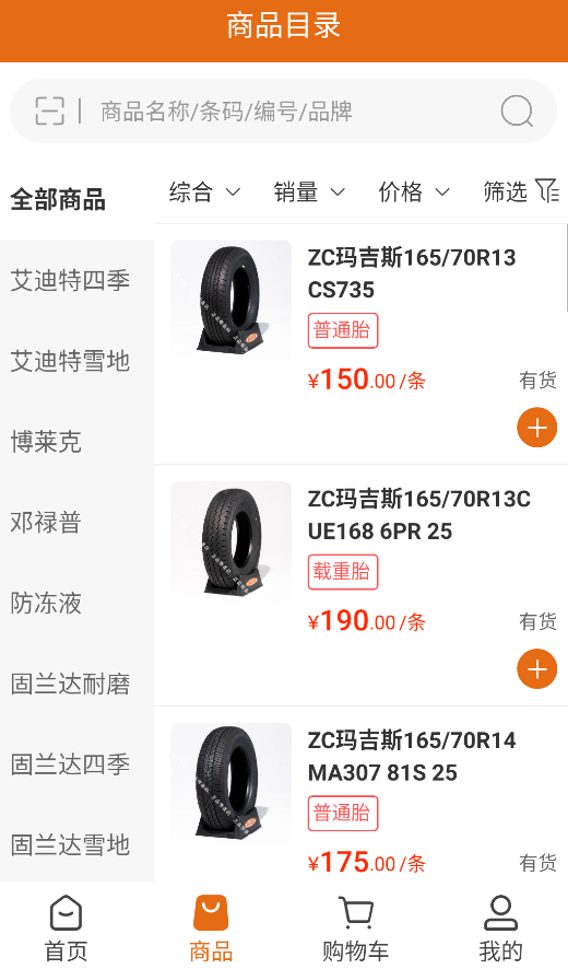 1、商品中心涵盖200+轮胎品牌,支持按尺寸、季节等15个维度筛选。库存预警功能实时更新货源状态,紧缺商品提供替代方案。
