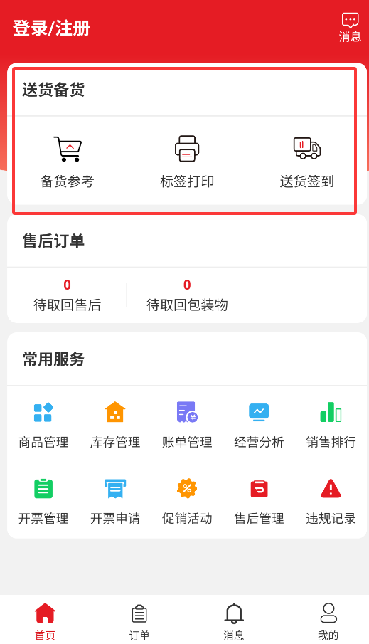 1、登录系统后,首页驾驶舱直观展示当日送货任务、备货进度等关键数据,支持快速进行标签打印和到货签收操作。