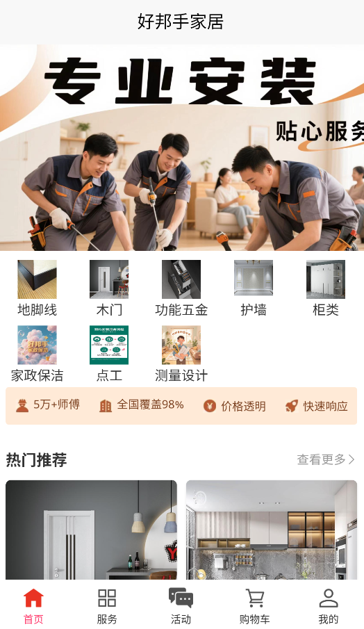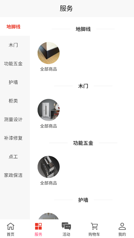 2、服务分类清晰展示地脚线安装、木门调试、五金件更换等常见项目,每个服务都有明码标价和预计耗时。