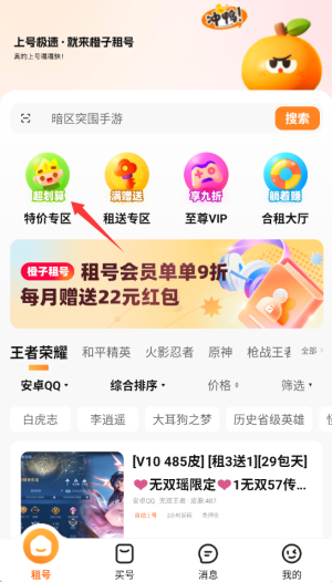 1、进入橙子租号APP后,在首页导航栏中找到并点击"特价专区"入口。