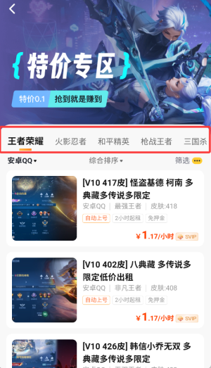 2、浏览热门游戏分类,根据个人喜好选择想要租用的游戏账号类型。