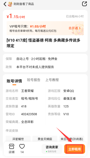 3、点击右下角"租用"按钮,确认订单信息后即可完成账号租赁。