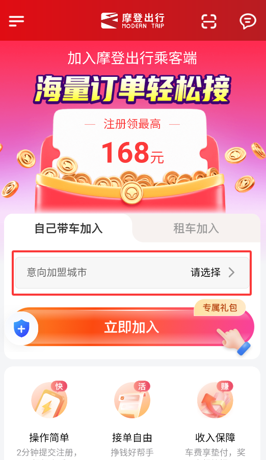 1、打开应用后,在首页点击"司机加盟"按钮,进入城市选择界面,系统会优先推荐当前需求较高的加盟城市。