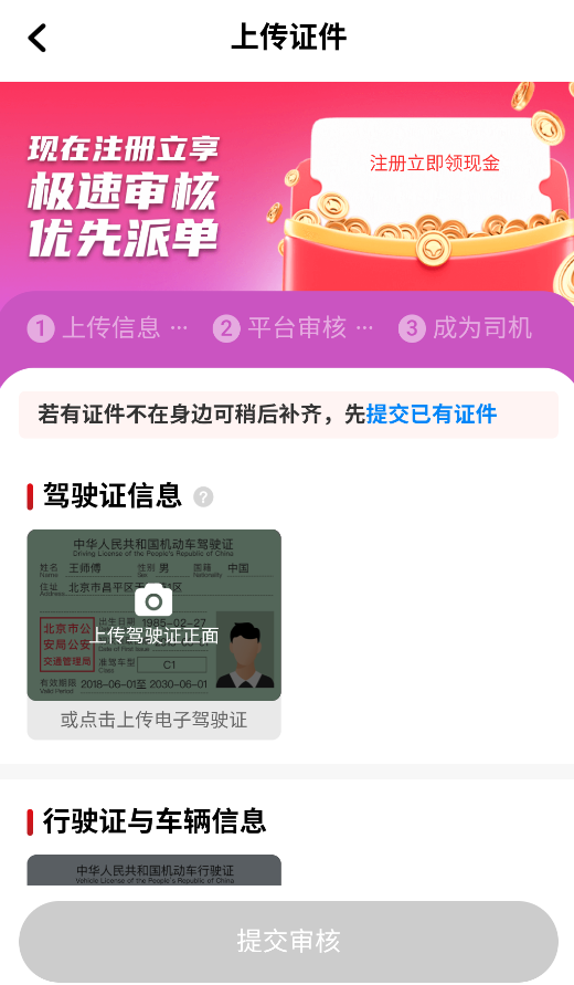 3、按要求上传驾驶证、行驶证等证件照片(需清晰可见关键信息),提交后3个工作日内完成审核,通过后即可接单。