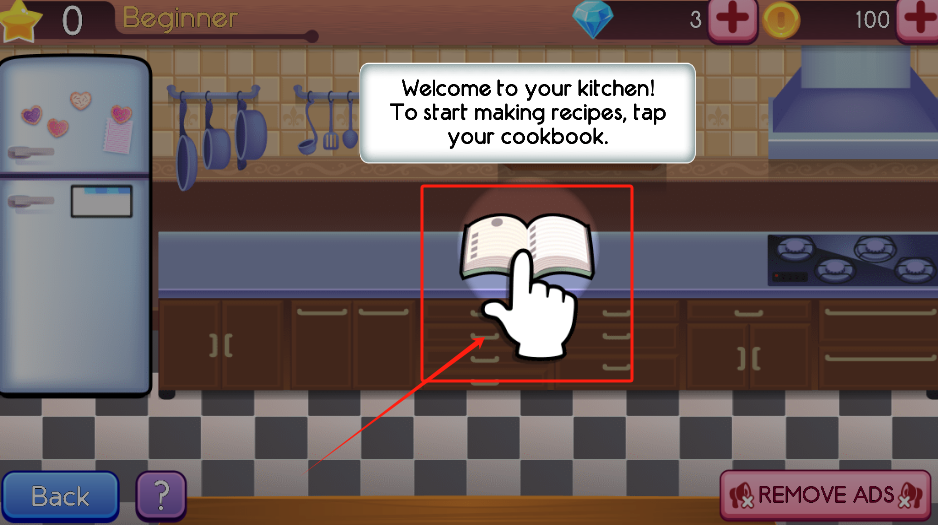 2、点中间的食谱书开始做菜,左上角显示新手等级,右边是金币数量。