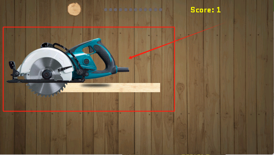 2、电锯已经启动,分数变成1分,红框标出要切割的位置。