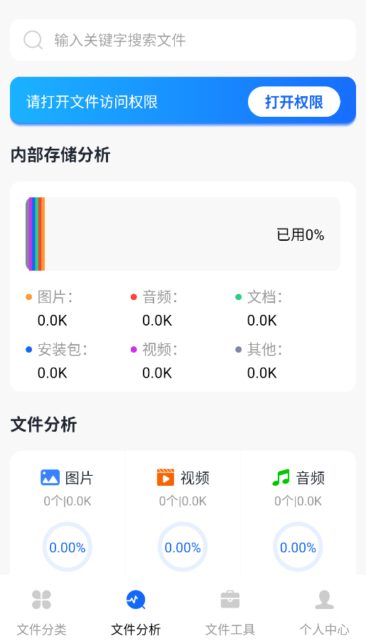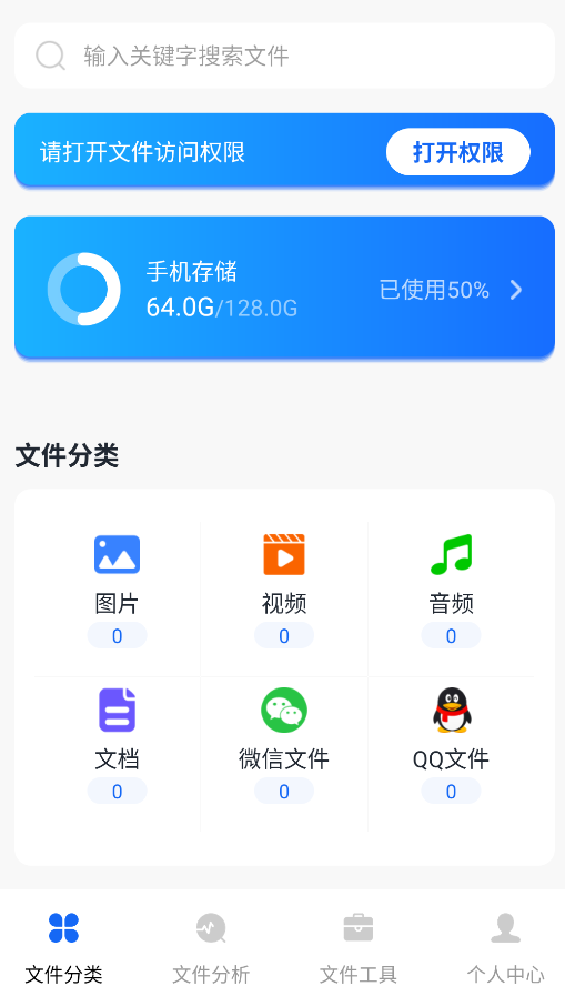 1、打开应用后,首页直观展示手机存储空间分布,可分类浏览图片、视频、文档等文件,支持按大小/时间排序管理。