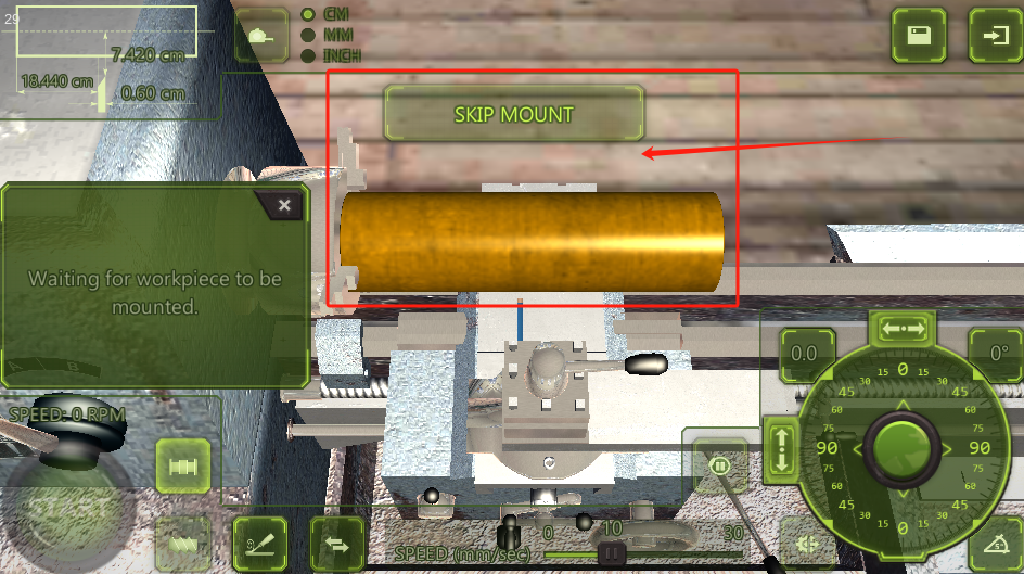 3、工件放机器上就能加工,点SKIPMOUNT跳过安装,下面调转速。