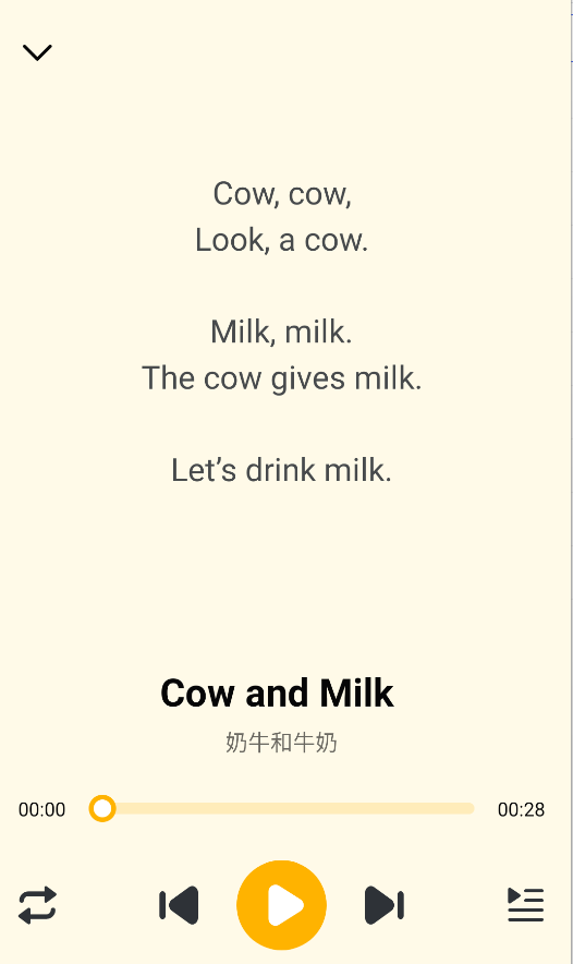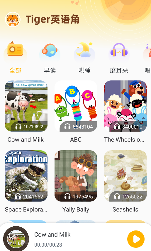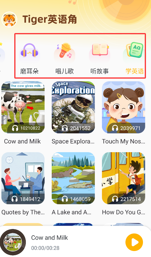 3、切换顶部标签选择学习模式:磨耳朵(隐藏歌词盲听)、唱儿歌(童谣跟唱评分)、听故事(情景对话)、学英语(语法点解析)。