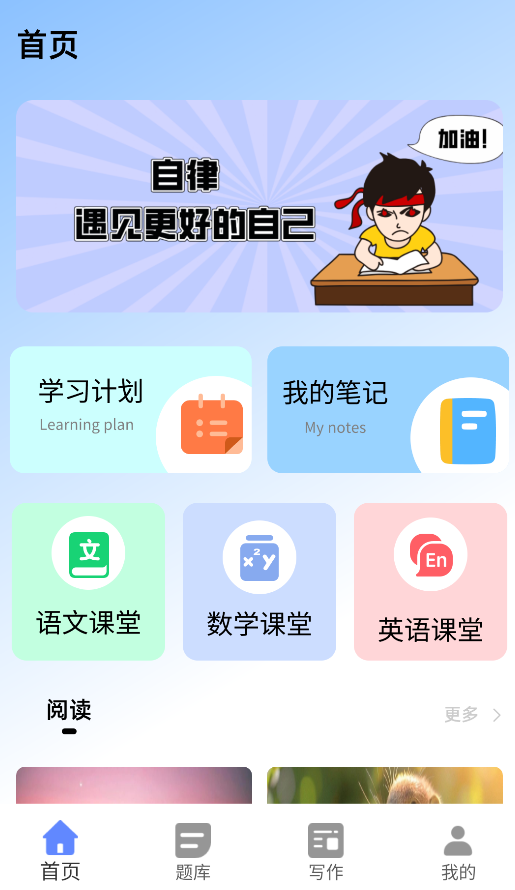 1、打开APP后,首页提供学习计划制定、笔记管理以及语文、数学、英语等学科课程入口。