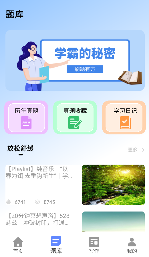 刷题宝这个学习软件挺适合备考用的。里面题库很全,语文数学英语这些主科都有,平时刷刷题挺方便的。题目类型也多,做完能学到不少解题技巧。最贴心的是还准备了放松的音乐,学累了可以听听缓解压力。要考试的学生党可以试试,刷题复习效果不错。