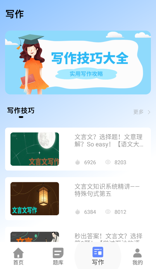 3、切换到写作专区,能够系统学习各类写作方法技巧,提升写作能力。