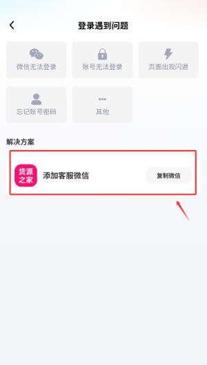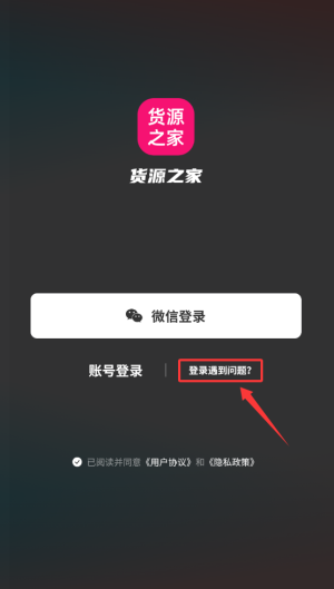 1、进入货源之家APP后,在登录页面点击"登录遇上问题"选项,进入帮助中心。
