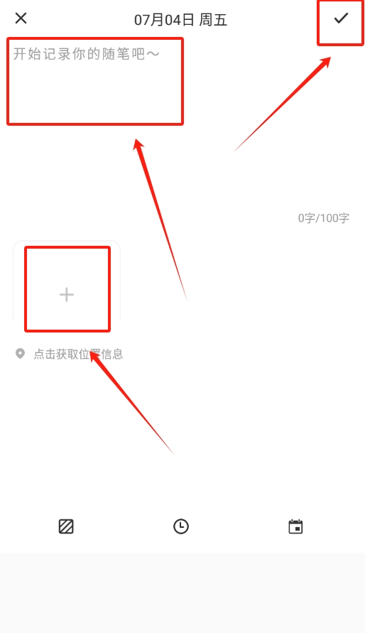 2、在记录页面输入想说的话,添加喜欢的照片,确认后点击右上角的勾号保存。