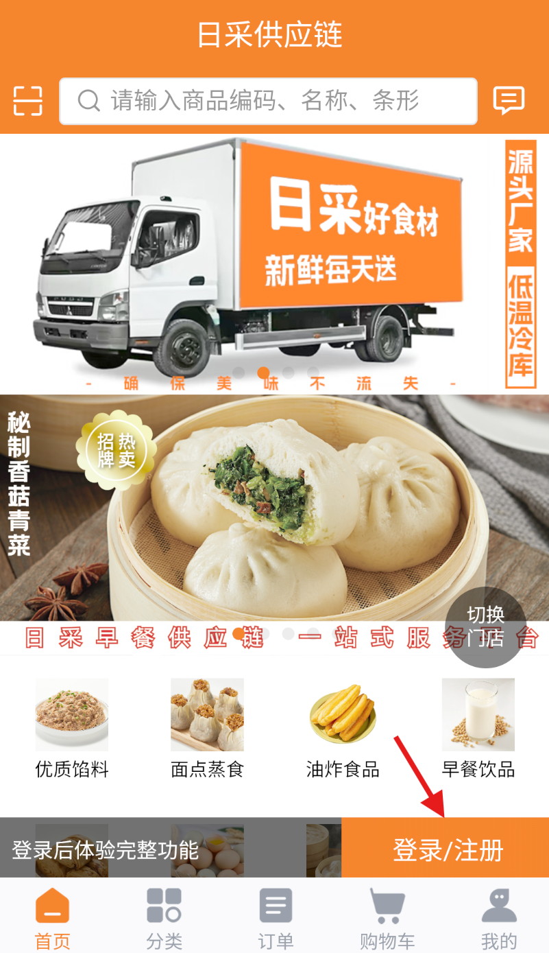 1、启动日采供应链软件,在界面导航栏上方找到 “登录 / 注册” 选项并点击进入。