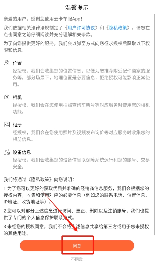 1、打开云卡车服软件,首先映入眼帘的就是协议页面,点一下同意就能继续下一步。