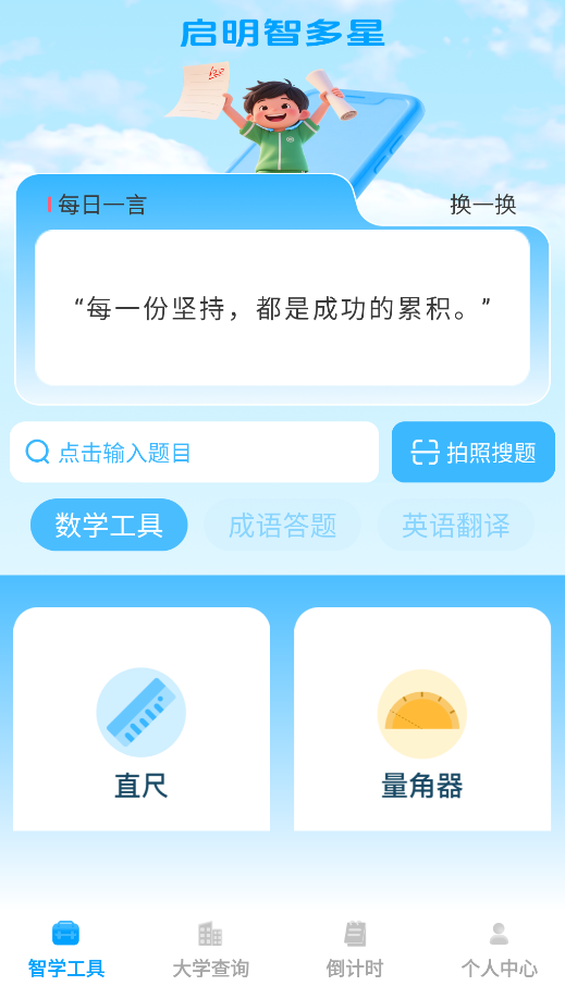 启明智多星这个学习软件功能挺多的,主要是学成语的,内容很丰富。里面还有数学小工具,量角器、计算器这些日常能用上。查大学信息也挺方便,输入校名就能看排名和介绍。想提升文化知识的话,用这个软件挺合适的。