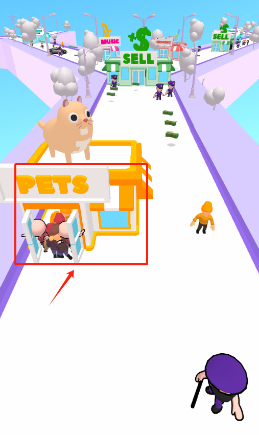 2、看到道路左侧黄色宠物店PETS招牌,用手指点这个店铺图标,就能进入宠物商店逛逛哟。