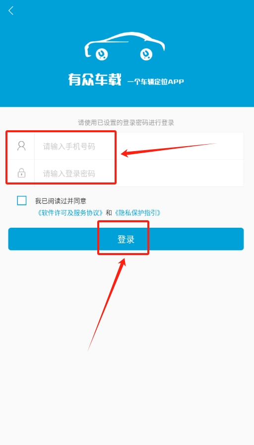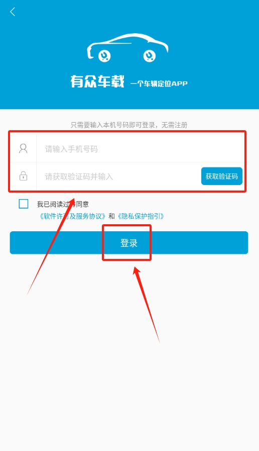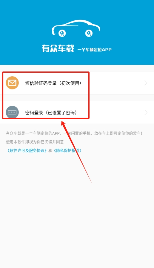 1、打开有众车载,登录页面能选两种方式,要么用短信验证码登录,要么用账号密码登录,按需选一种就行。