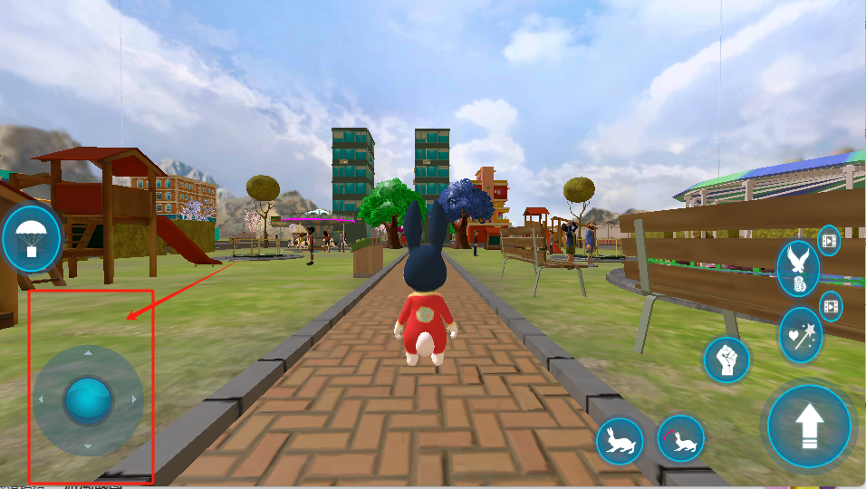 2、用屏幕左下角蓝色摇杆控制兔子移动,点击伞形按钮或右侧功能键进行操作。