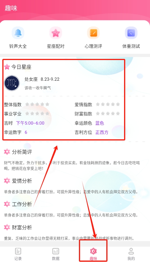 3、觉得记录太单调,去趣味页面逛逛,里面能查看星座相关内容,在记录健康的同时还能找点乐趣挺不错的。