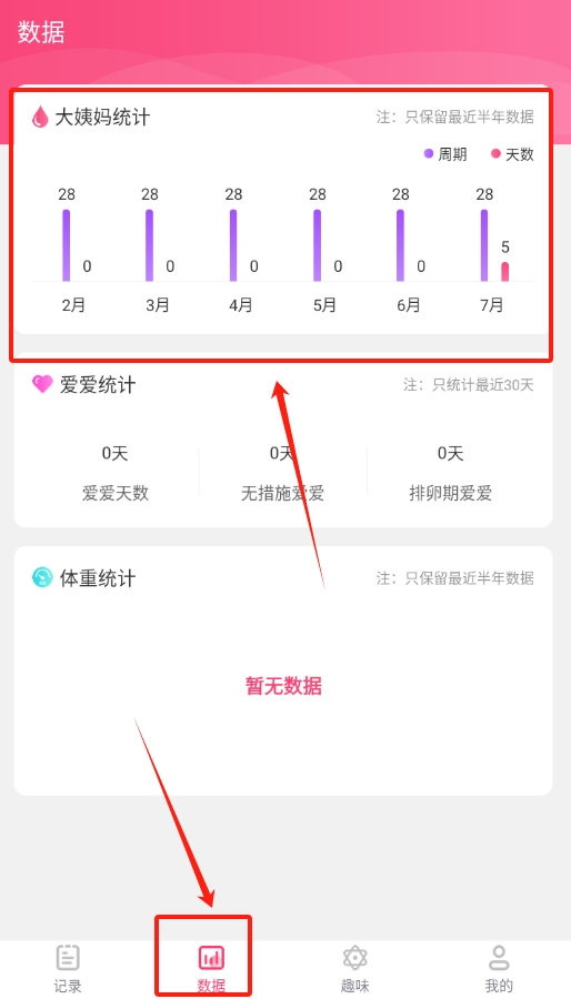 2、想看之前的记录,点进数据页面,这里有大姨妈的各种统计信息,什么时候来的、周期多久都能清楚看到很方便。