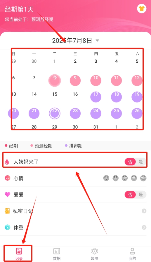 2、记录经期在对应板块点击添加,输入时间、痛经程度等,写私密日记设密码,用数据汇总查看经期和体重变化。