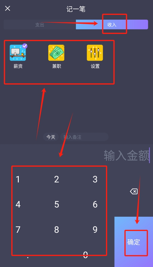 3、记收入也同理,选好对应的收入类型,填好收入金额,最后点击保存,轻松记录收入情况。
