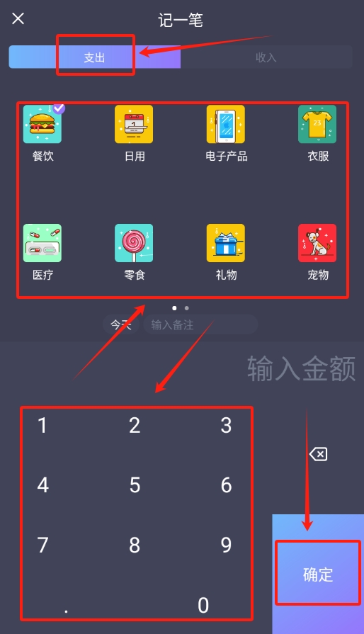 2、要是记支出,就从众多支出类型里挑一个,再输入支出的具体金额,确认无误后点击保存。