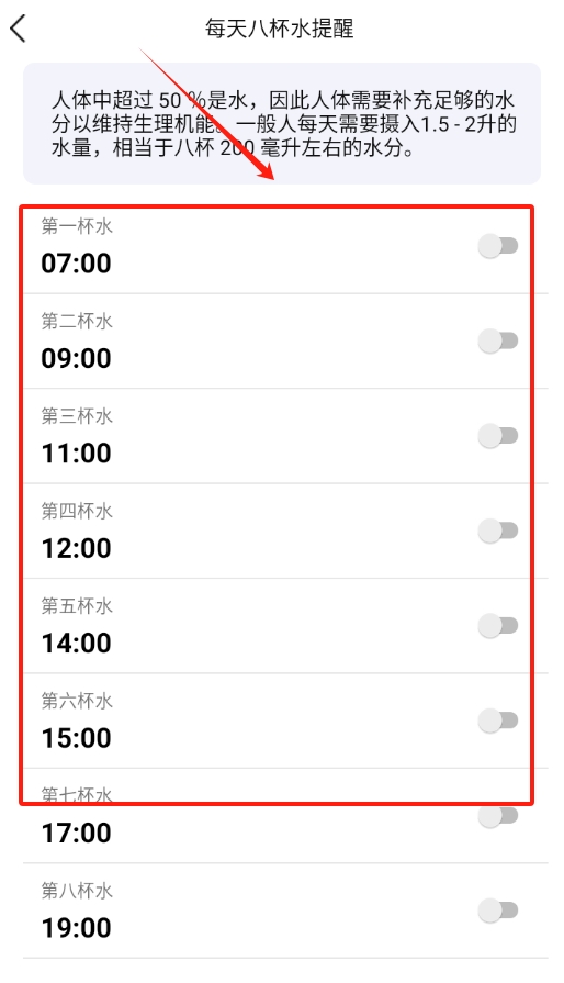 2、软件里有喝八杯水的提醒功能,到了该喝水的时间会自动提示,跟着提醒喝水,能帮着养成规律饮水的好习惯。