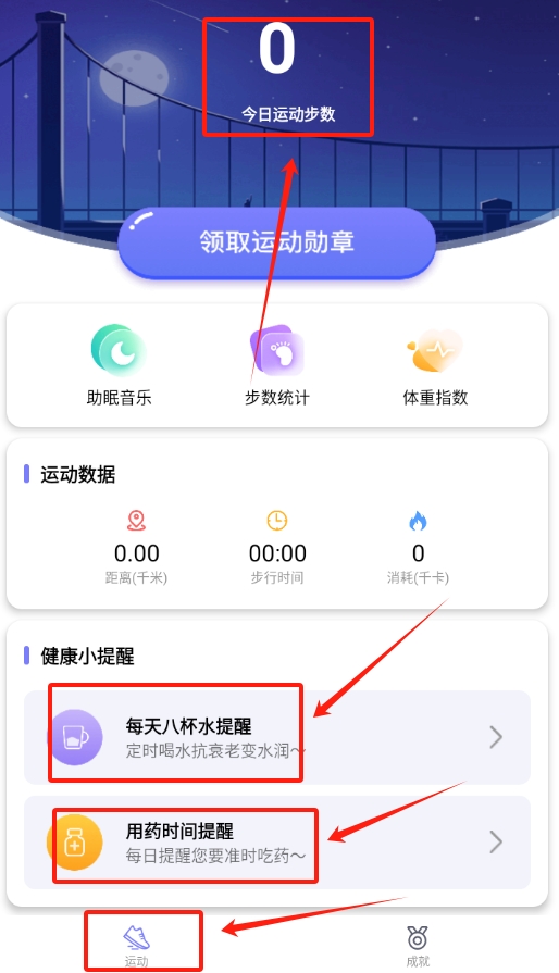 3、自动统计运动数据,展示运动距离、时长和卡路里,音乐助眠有多种自然声音,勋章激励让运动更有动力。