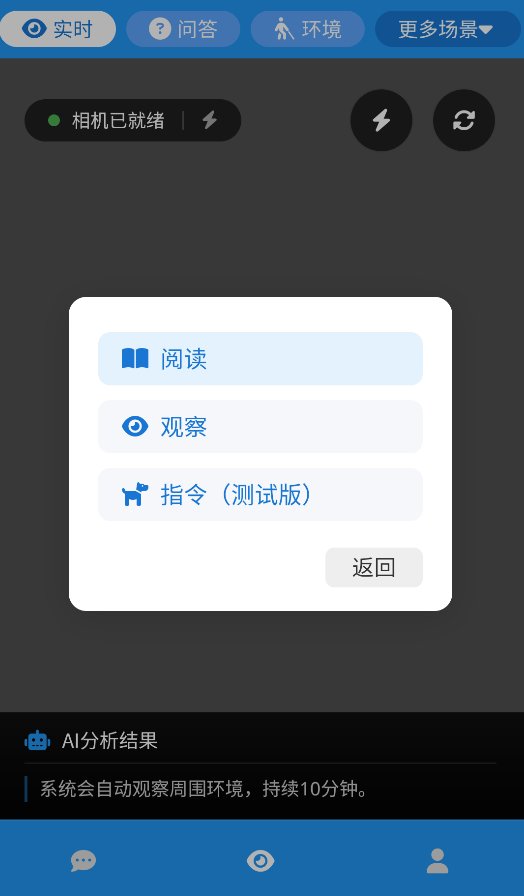 2、多模式切换:根据实际需求选择不同功能模块,如观察模式、对话模式等,提升信息获取效率。