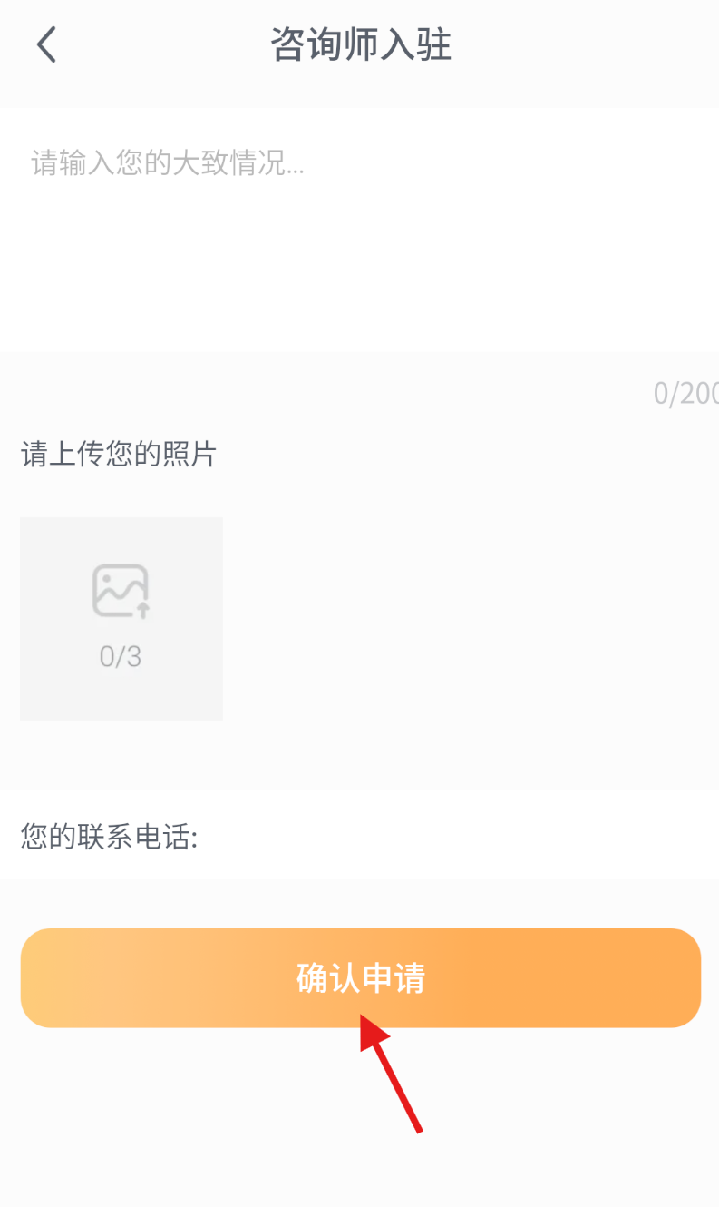 2、在 “我” 页面里,找到 “咨询师入驻” 的选项并点击,跳转至入驻申请的专门页面。