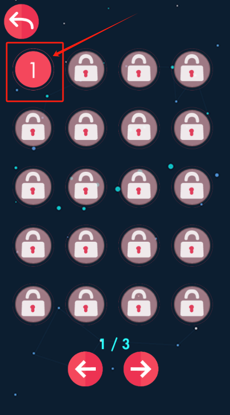 2、左右滑动翻页查看不同关卡,选带数字1的红圈开始第一关挑战。