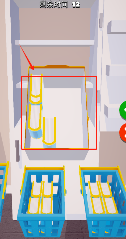 3、看到冰箱里瓶瓶罐罐快摆满,剩12秒赶紧按红框提示继续往蓝色筐子整理剩余物品呀。