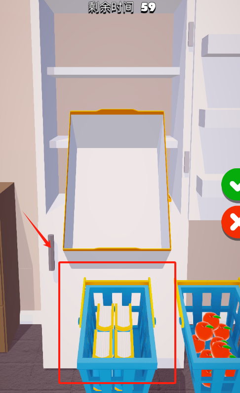 2、第二张图:看到冰箱空荡荡还有59秒倒计时,点绿色对勾按钮开始往空冰箱里放拖鞋和西红柿吧。