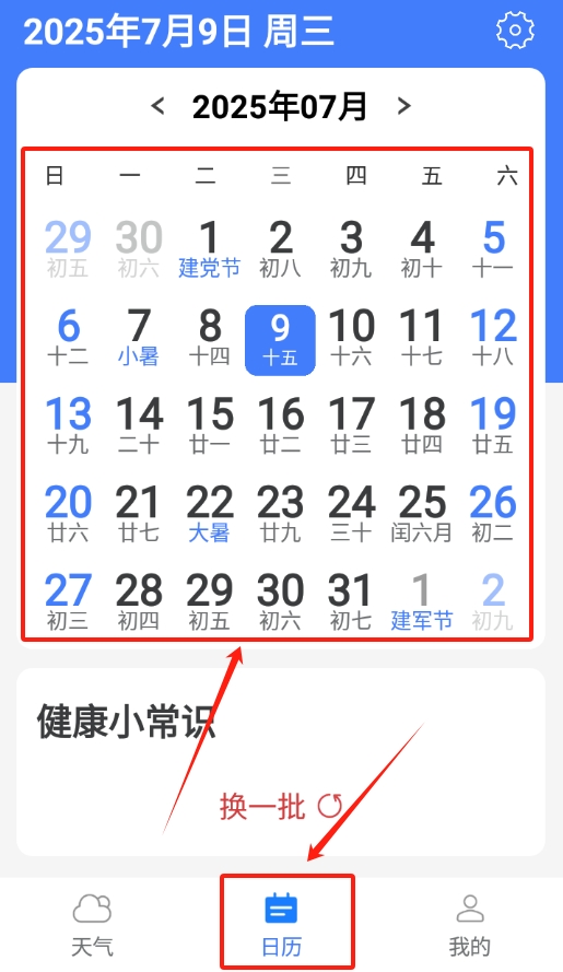 3、想看日期相关的内容,切换到日历页面,这里能看到日期信息,还能结合天气情况,提前规划未来的出行安排。