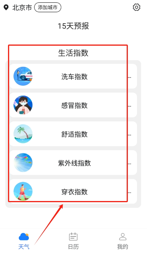 2、除了天气预报,在首页还能找到生活指数板块,点进去可以查看穿衣、出行等建议,帮着更好地安排日常活动。