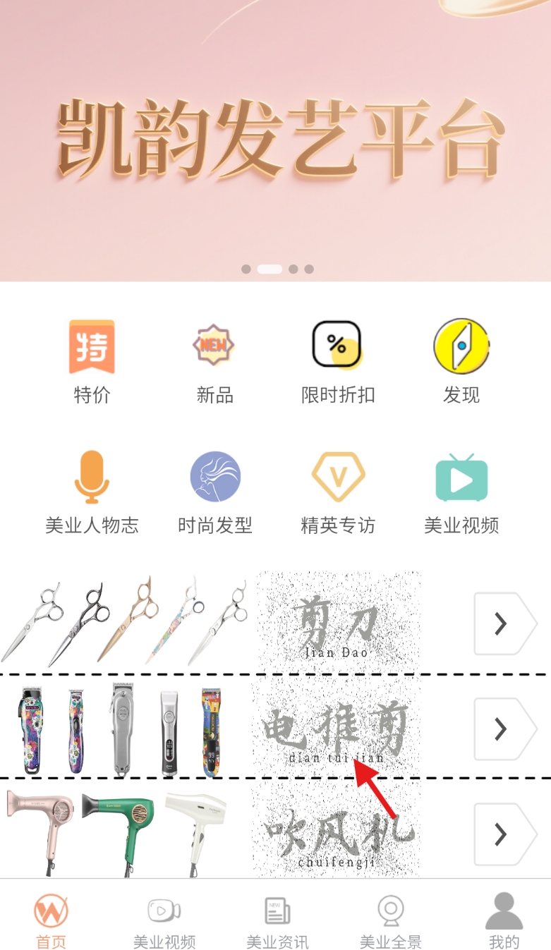 凯韵发艺平台能获取丰富美发工具信息,剪刀、吹风机等各类产品齐全,设特价折扣与新品专区,助掌握优惠和潮流单品动态。美业视频有发型教程等,可学专业知识;美业资讯更新行业动态,带来前沿趋势,还有美业全景店功能,打造一站式美发服务体验。