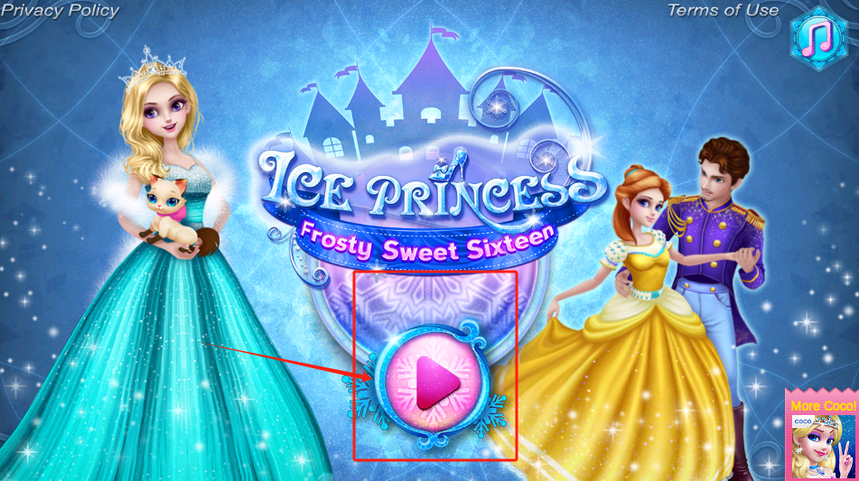 1、点击粉色播放按钮,开始冰公主霜寒甜心十六岁游戏冒险。