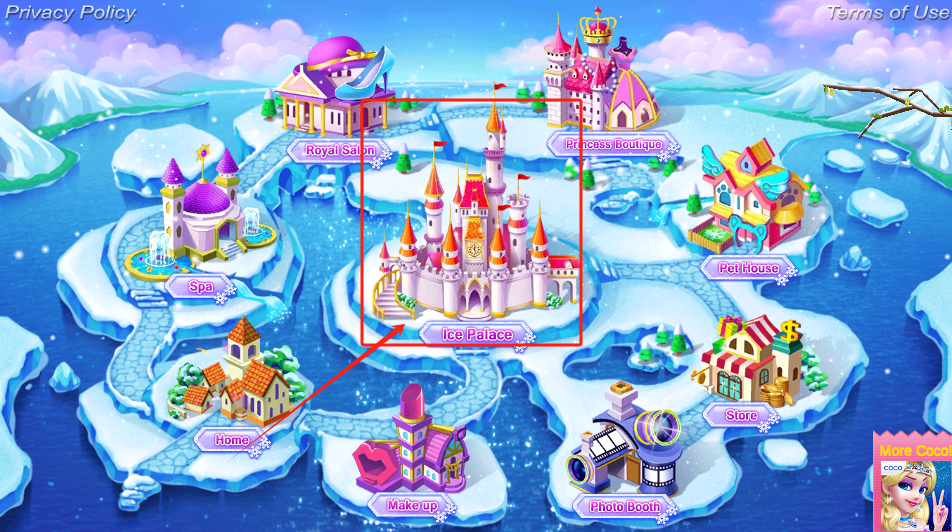 2、点红框冰宫进入主场景,逛皇家沙龙和公主精品店探索地图。