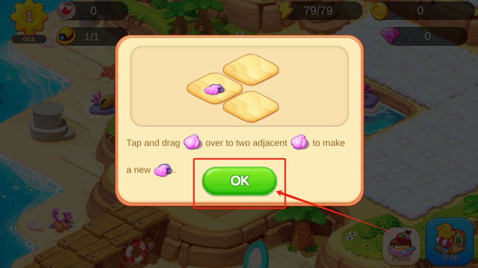 1、拖动框中三块紫宝石方块,放到相邻位置合成新宝石,点绿色OK按钮确认操作。