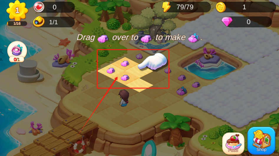 2、按箭头方向拖动紫色物件到指定区域,合成新物品获取资源,提升游戏进度。