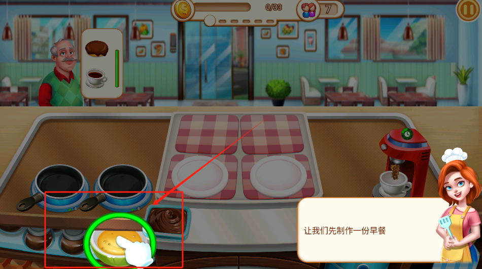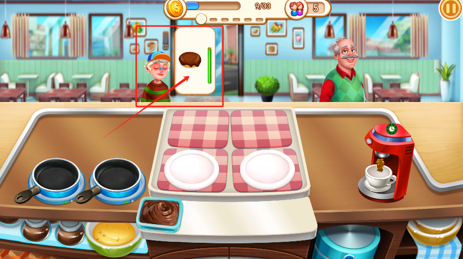 3、按红框进度条提示做食物,点击咖啡机或锅具,满足顾客需求提升评分。