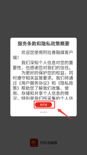 1、启动阿拉善融媒APP后,首次使用需阅读并同意服务条款和隐私政策,点击确认进入主界面。