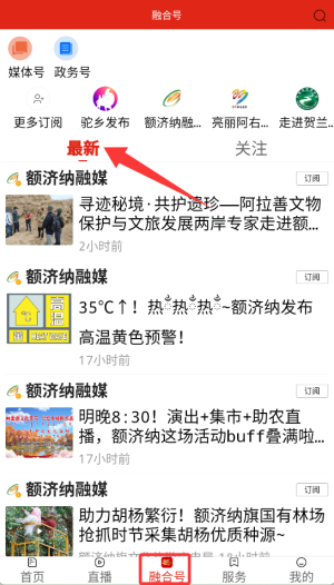 2、在首页导航栏点击"融合号"选项,查看本地融媒体发布的各类资讯内容。