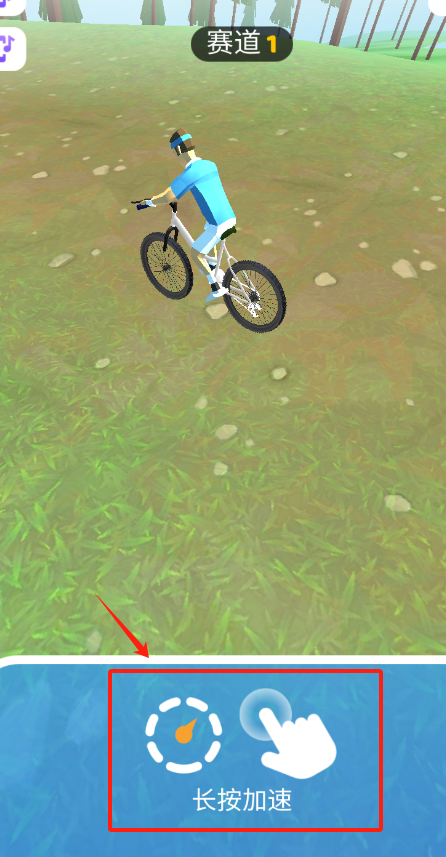 1、蓝衣人骑山地车,长按屏幕加速往前冲,背景草地树木飞快后退,赛道1开始狂飙。