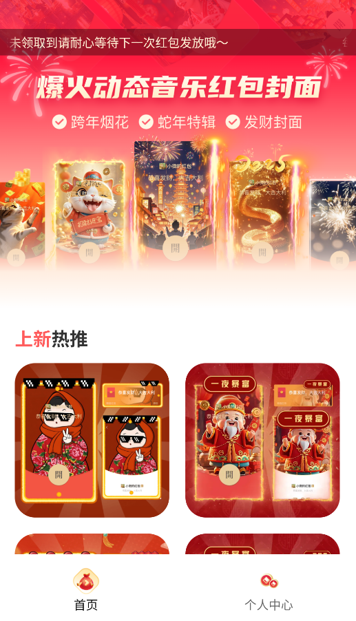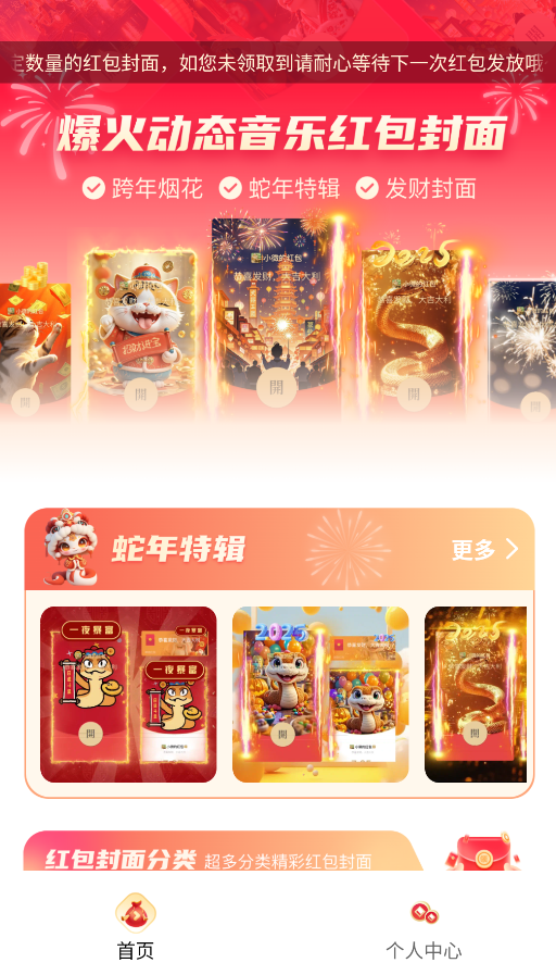 1、打开应用后,首页会展示"蛇年专属"红包专题页面,内含生肖限定款红包封面和祝福语模板。
