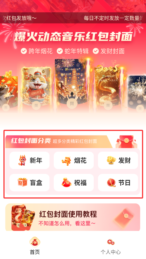 2、通过分类导航可挑选不同风格的红包封面,包括传统节日、现代潮流、盲盒惊喜等多样化主题。